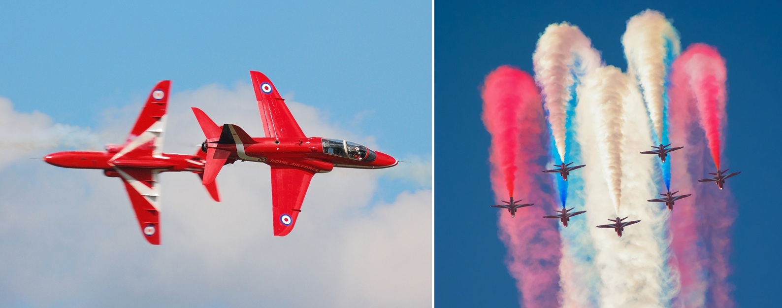 Destacados por sus aeronaves rojas y estelas de humo rojo, azul y blanco que representan la bandera del Reino Unido. Su formación “Diamond Nine” de nueve aeronaves es icónica.