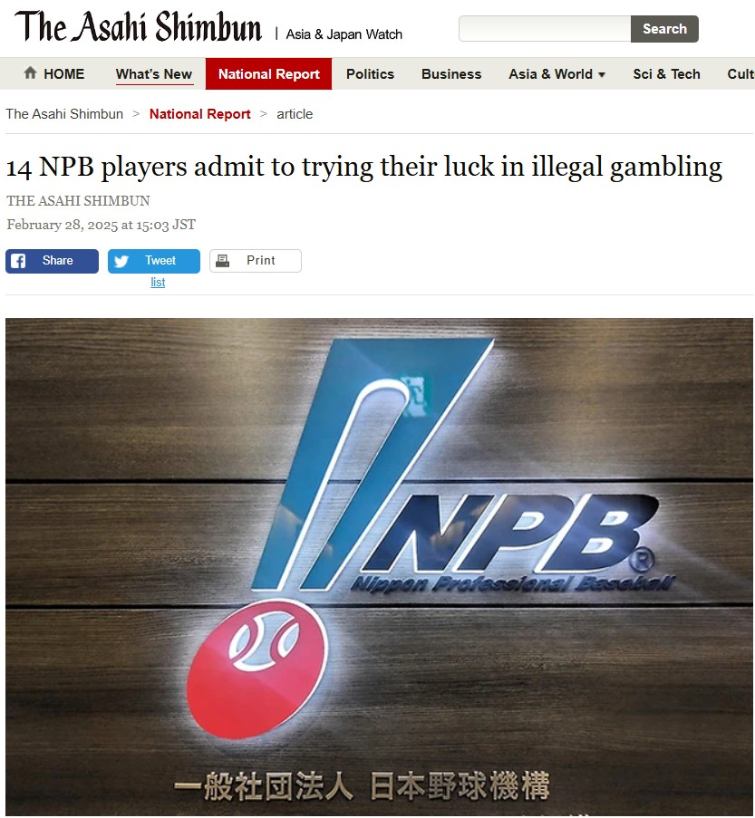 日本最受欢迎的职业棒球(NPB)也因非法赌博而失信。赛季初以来,西武狮、读卖巨人等名门球队16名以上球员被查出参与网络非法赌博。