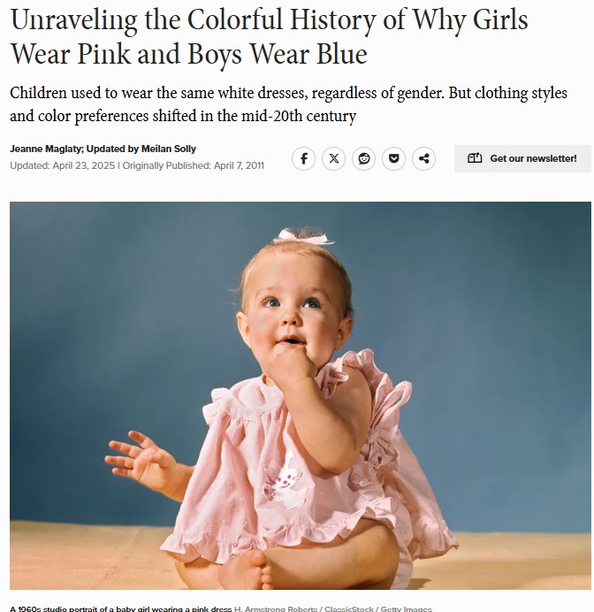 After WWII, mass production and consumerism boomed. Companies realized that dividing colors by gender could double sales. If pink was labeled “for girls,” even families with only boys couldn’t hand down clothes — they’d have to buy new ones.