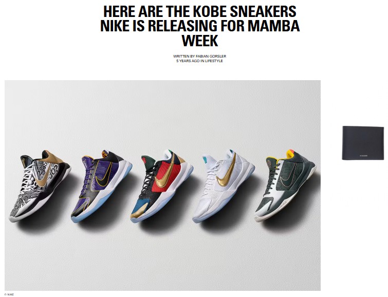 自2020年以来,耐克会在8月23日(生日)至8月24日期间举办“Mamba Week”,重新发售科比系列产品、发布致敬内容,并将部分收益捐赠给基金会。球迷们用 #MambaDay 和 #KobeDay 分享故事,许多活动也与青少年体育项目的募捐相结合。
