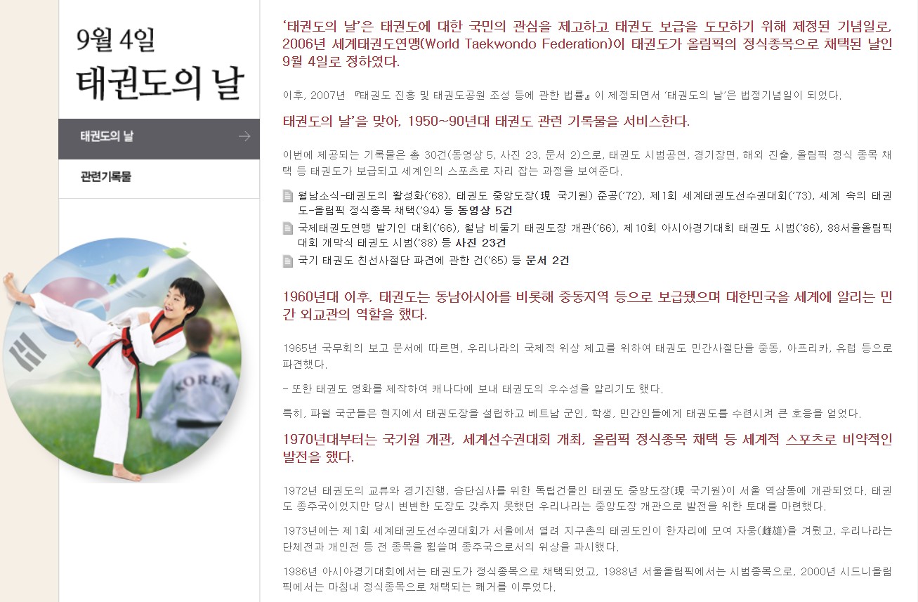 こうしたテコンドーの価値と地位を記念するため、毎年9月4日は「世界テコンドーの日」と定められ、世界中のテコンドー人の祭典が行われる。